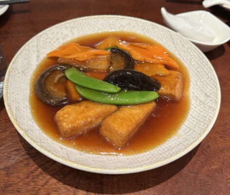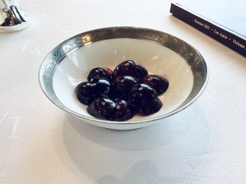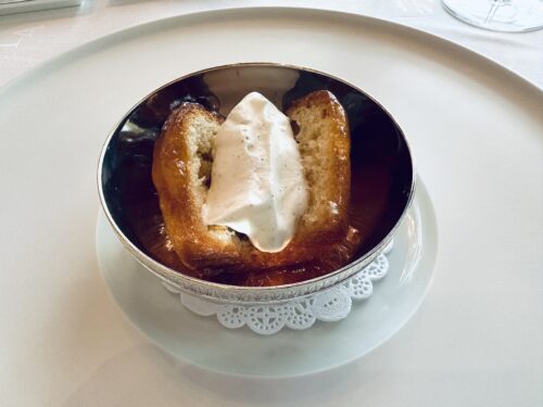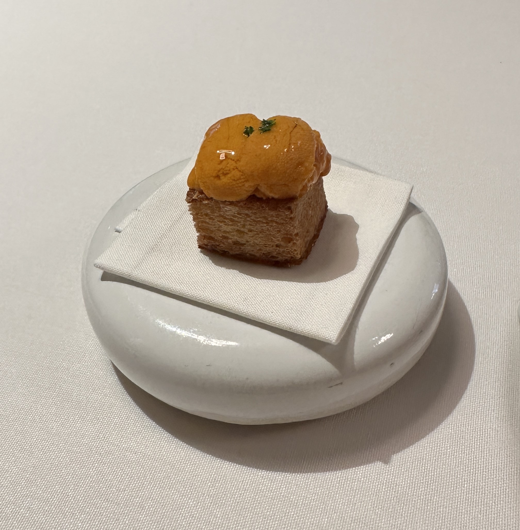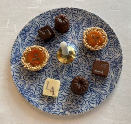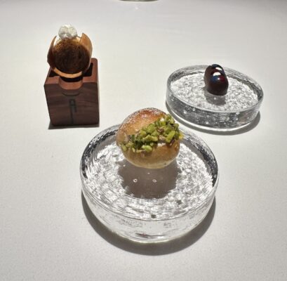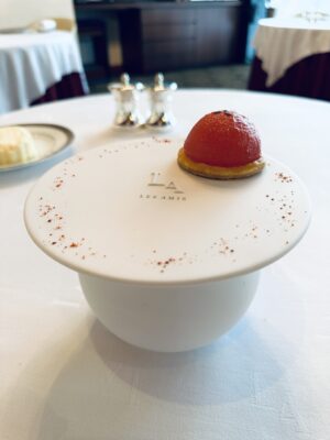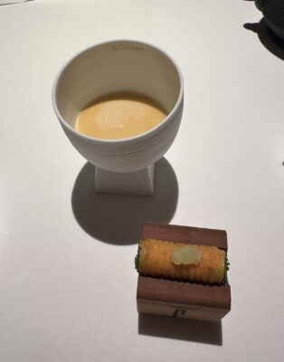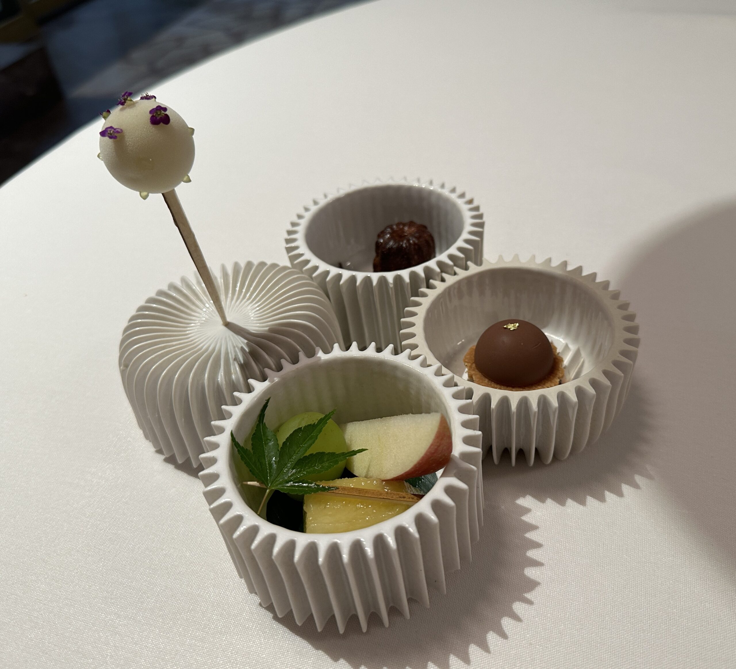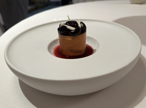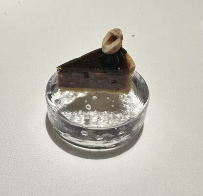 The main course was AKUNE GOLD BEEF – Vacherin Mont D’Or | Artichoke | Perigord Truffle. The award-winning beef was cooked perfectly—tender, richly flavored, and melting on the palate. Black truffle sauce provided earthiness, while the melted cheese added pungent complexity. A small side dish of pâté filled with veal, truffle, and hazelnut was an excellent accompaniment.