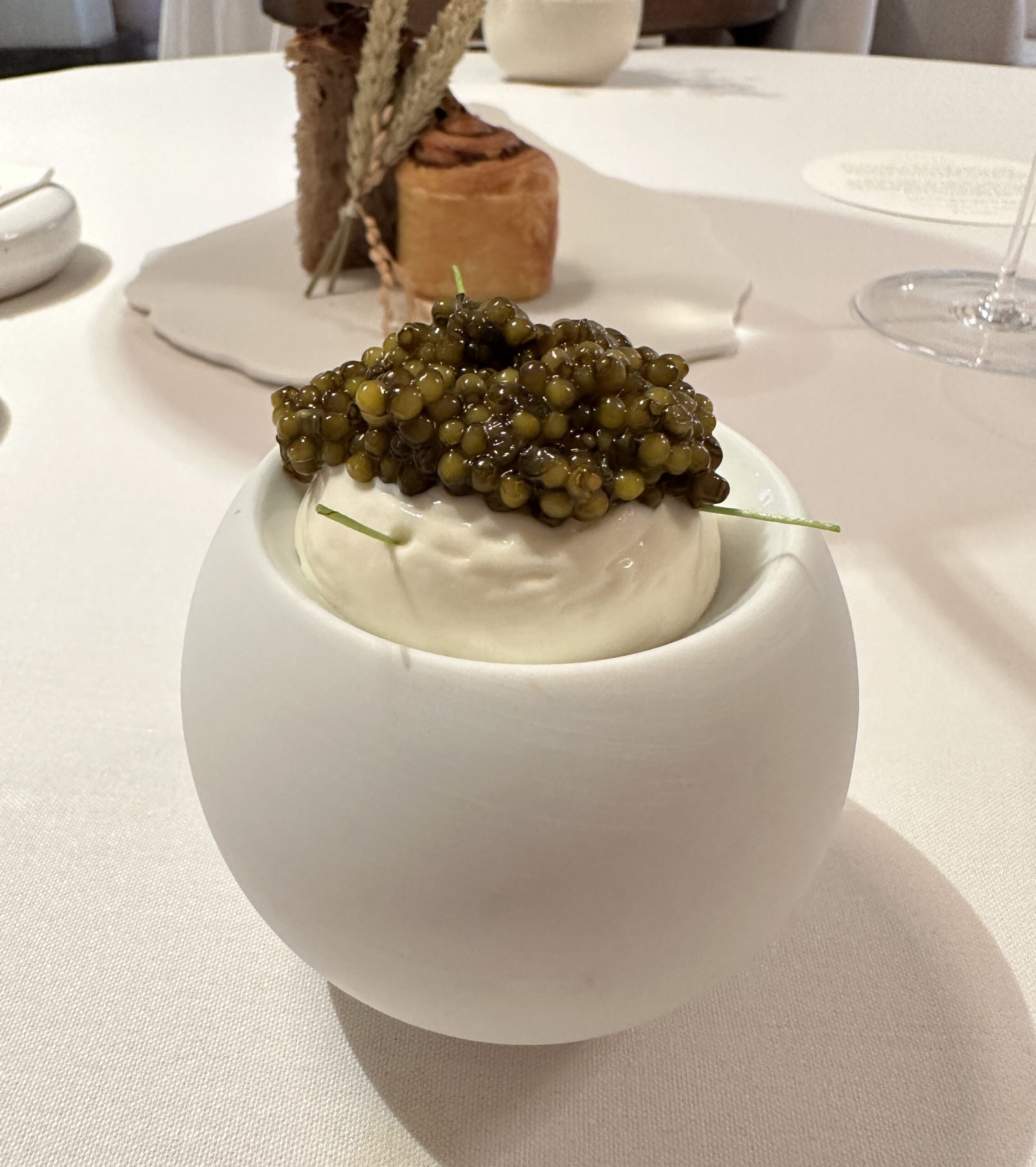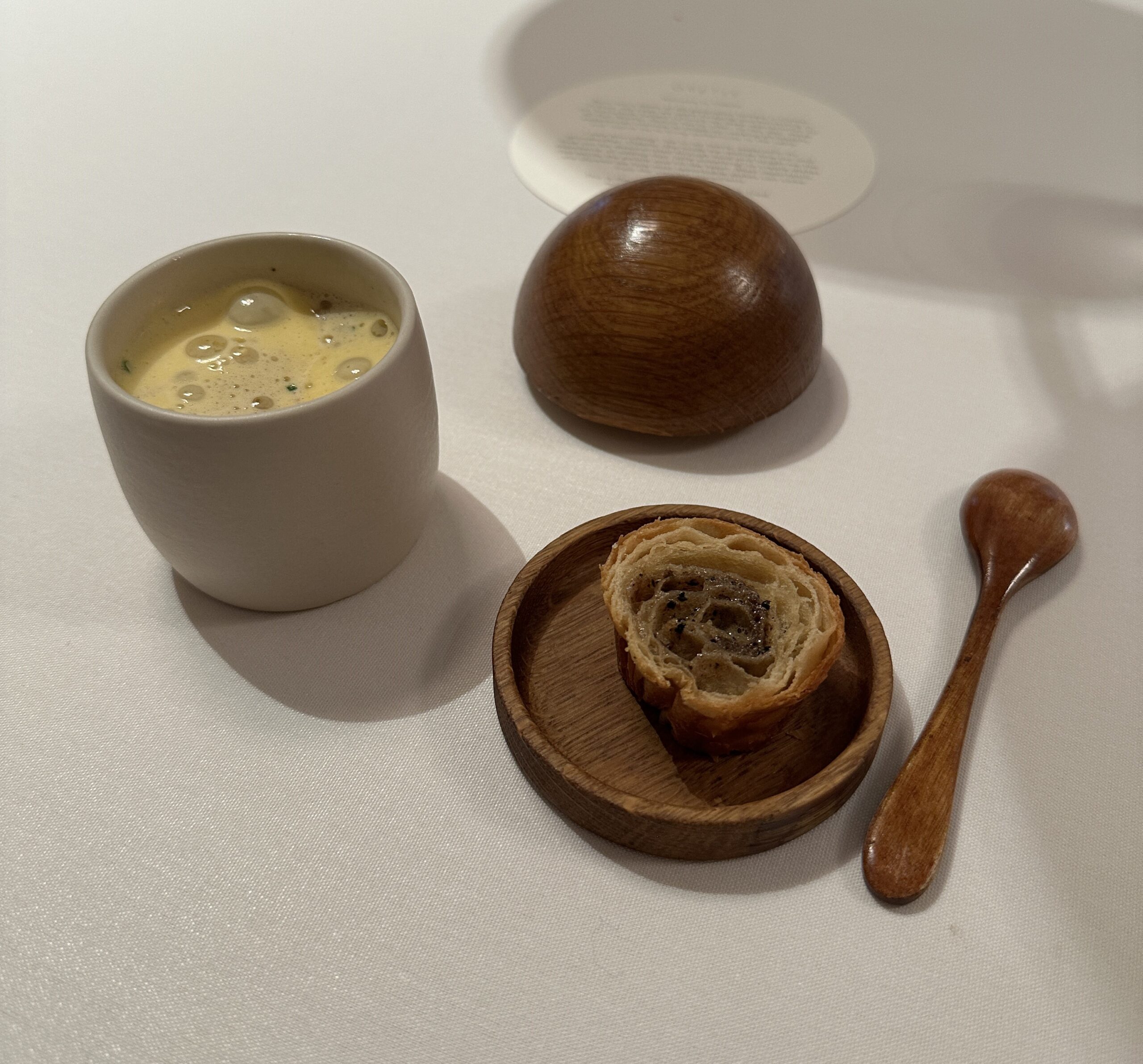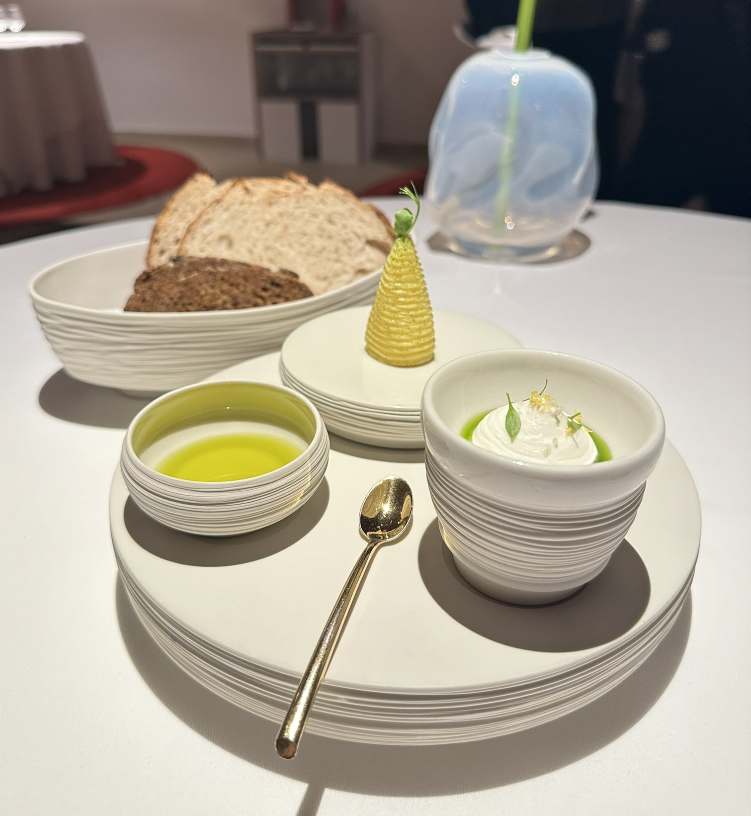 Bread & Butter was treated as a course of its own. Bread by Christian Klein & Julie Branter | Vienna/Munich, Butter made by Jean-Yves Bordier| Saint-Malo and Olive Oil “Cuvee Amador” made by Castillo de Canena | Jaen formed an exceptional trio. Two varieties of freshly baked sourdough were paired with butter that was silky, rich, and deeply flavorful—clearly a point of pride for the kitchen.