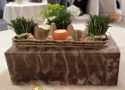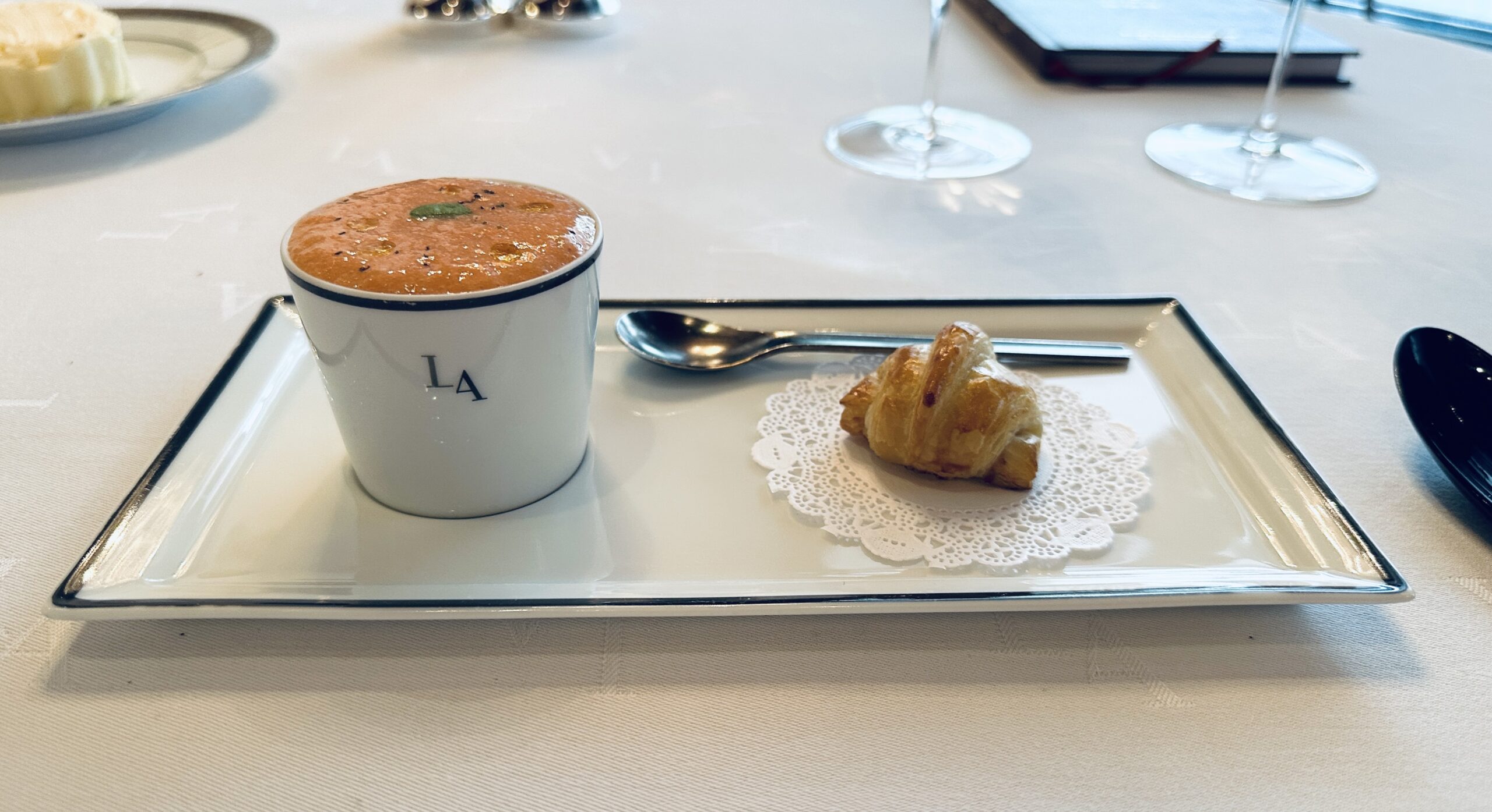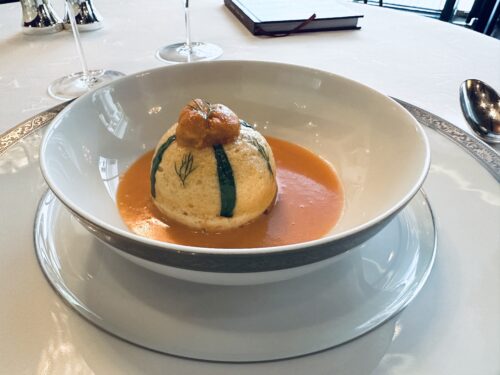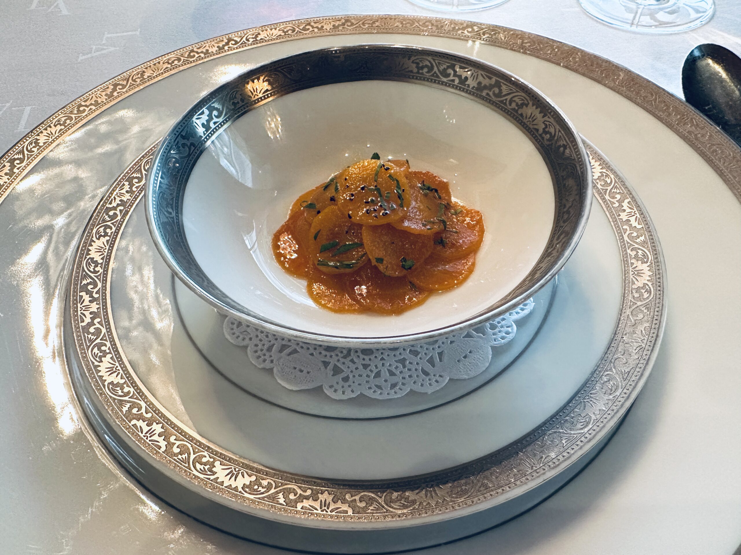 Bread & Butter was treated as a course of its own. Bread by Christian Klein & Julie Branter | Vienna/Munich, Butter made by Jean-Yves Bordier| Saint-Malo and Olive Oil “Cuvee Amador” made by Castillo de Canena | Jaen formed an exceptional trio. Two varieties of freshly baked sourdough were paired with butter that was silky, rich, and deeply flavorful—clearly a point of pride for the kitchen.