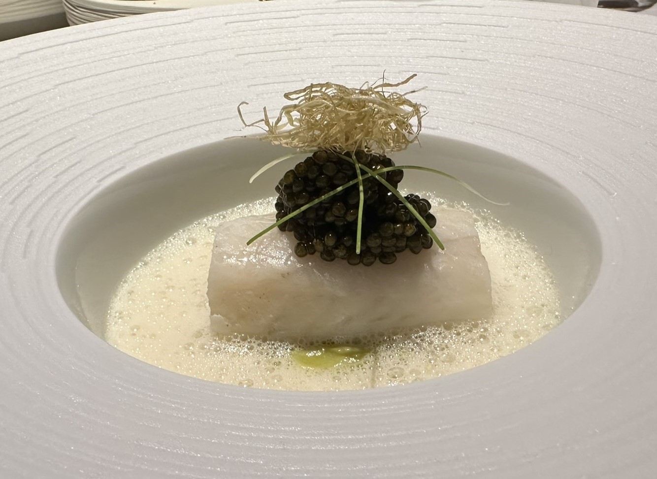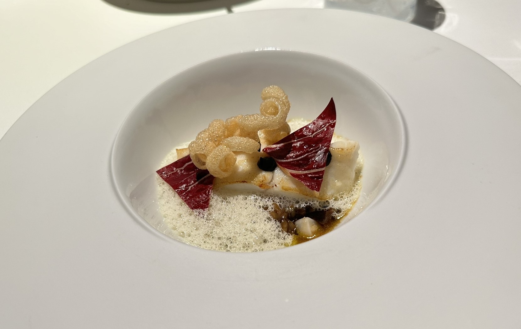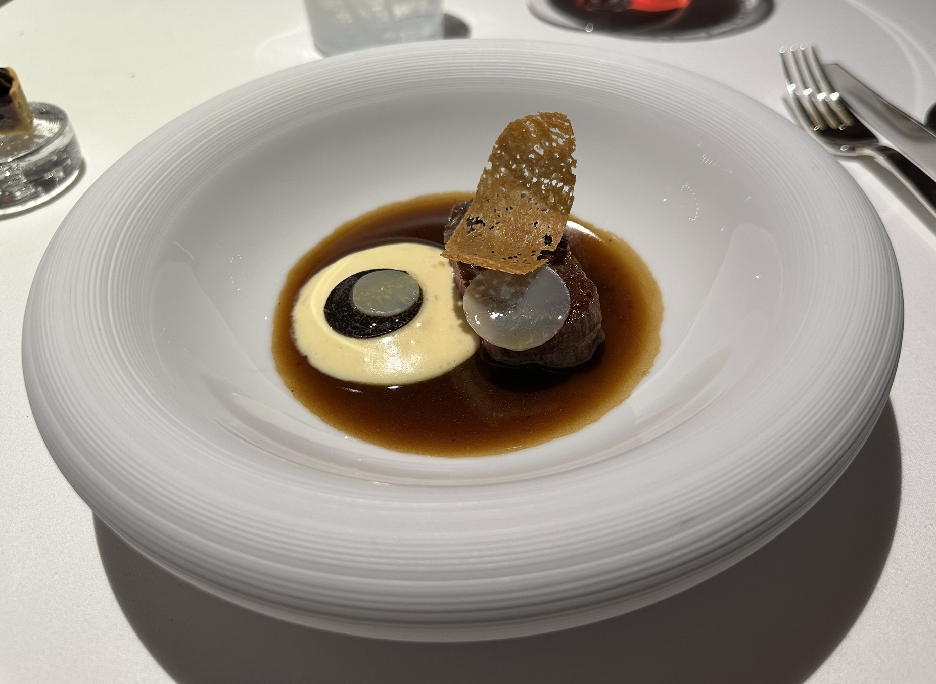 Next came PATAGONIAN TOOTHFISH – Leek | Viennese Sake | Oscietra N25. Delicate and buttery, the fish sat atop leek purée and a sake-based beurre blanc, adding depth and velvety richness. The caviar brought salinity, while fried kombu seaweed added crunch and contrast. This was followed by BRETON TURBOT – Morcilla | Razor Clam | Treviso. The turbot was tender and rested on bomba rice infused with turbot consommé. Razor clams added brininess, while Spanish morcilla brought savory depth. Treviso cabbage introduced bitterness that balanced the dish, and the fried turbot skin added a welcome crisp texture.