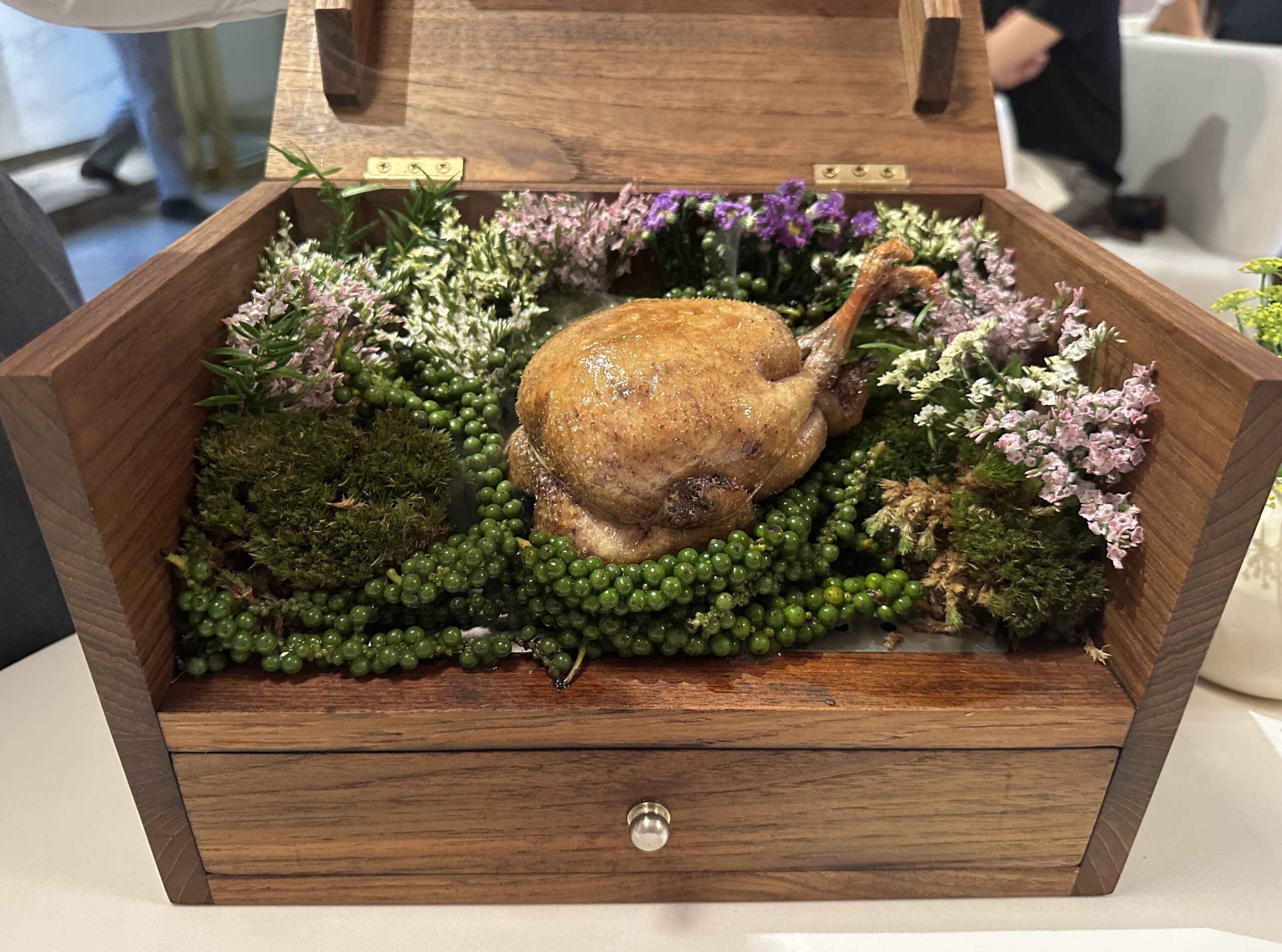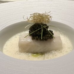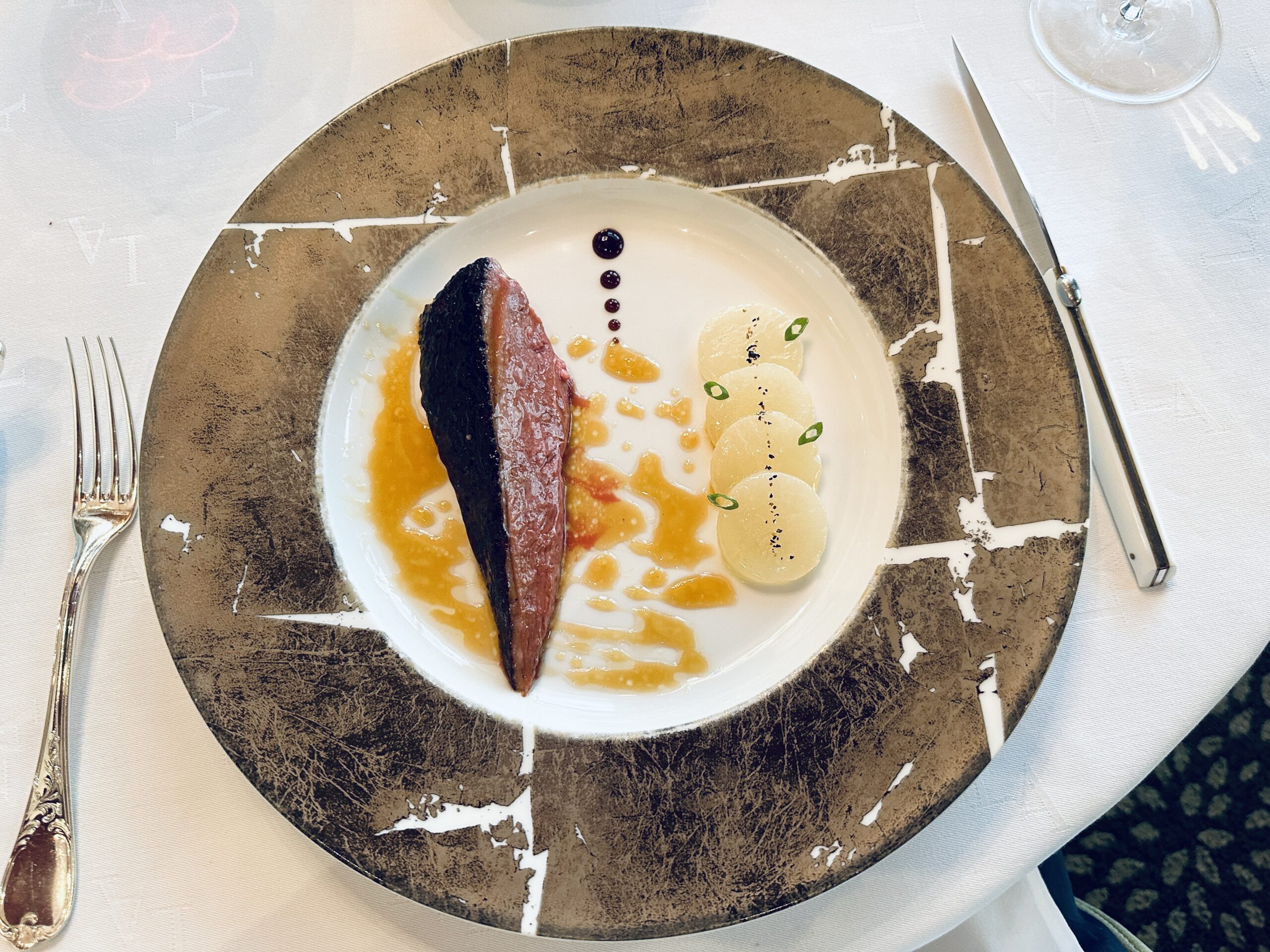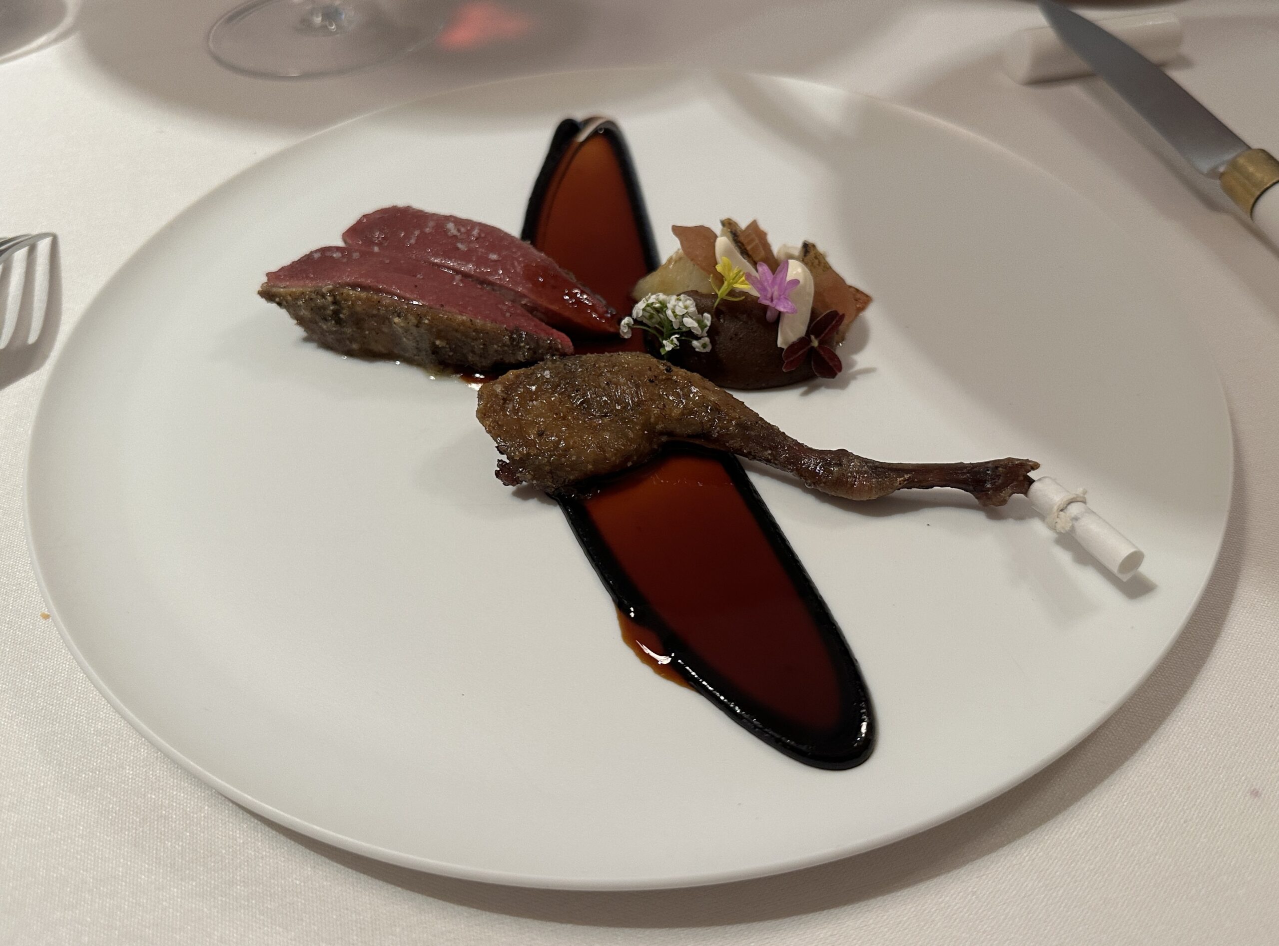 Next came PATAGONIAN TOOTHFISH – Leek | Viennese Sake | Oscietra N25. Delicate and buttery, the fish sat atop leek purée and a sake-based beurre blanc, adding depth and velvety richness. The caviar brought salinity, while fried kombu seaweed added crunch and contrast. This was followed by BRETON TURBOT – Morcilla | Razor Clam | Treviso. The turbot was tender and rested on bomba rice infused with turbot consommé. Razor clams added brininess, while Spanish morcilla brought savory depth. Treviso cabbage introduced bitterness that balanced the dish, and the fried turbot skin added a welcome crisp texture.