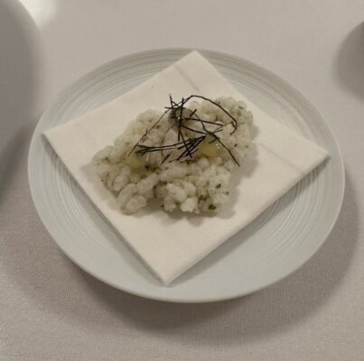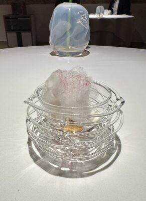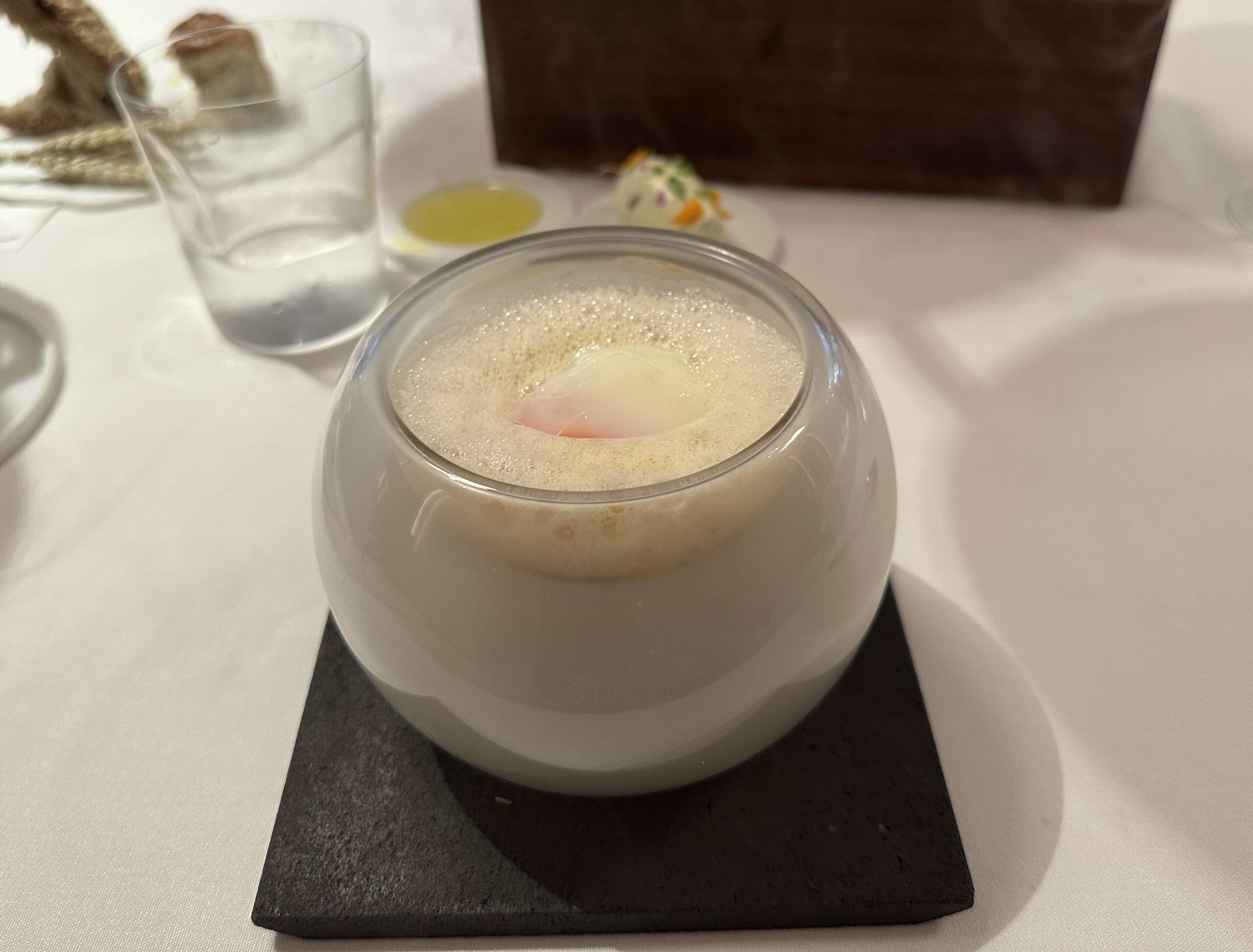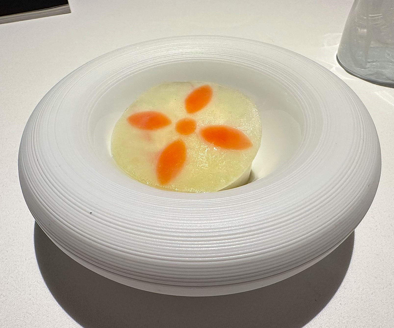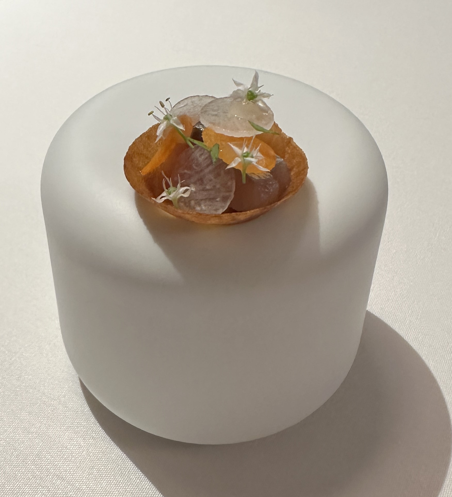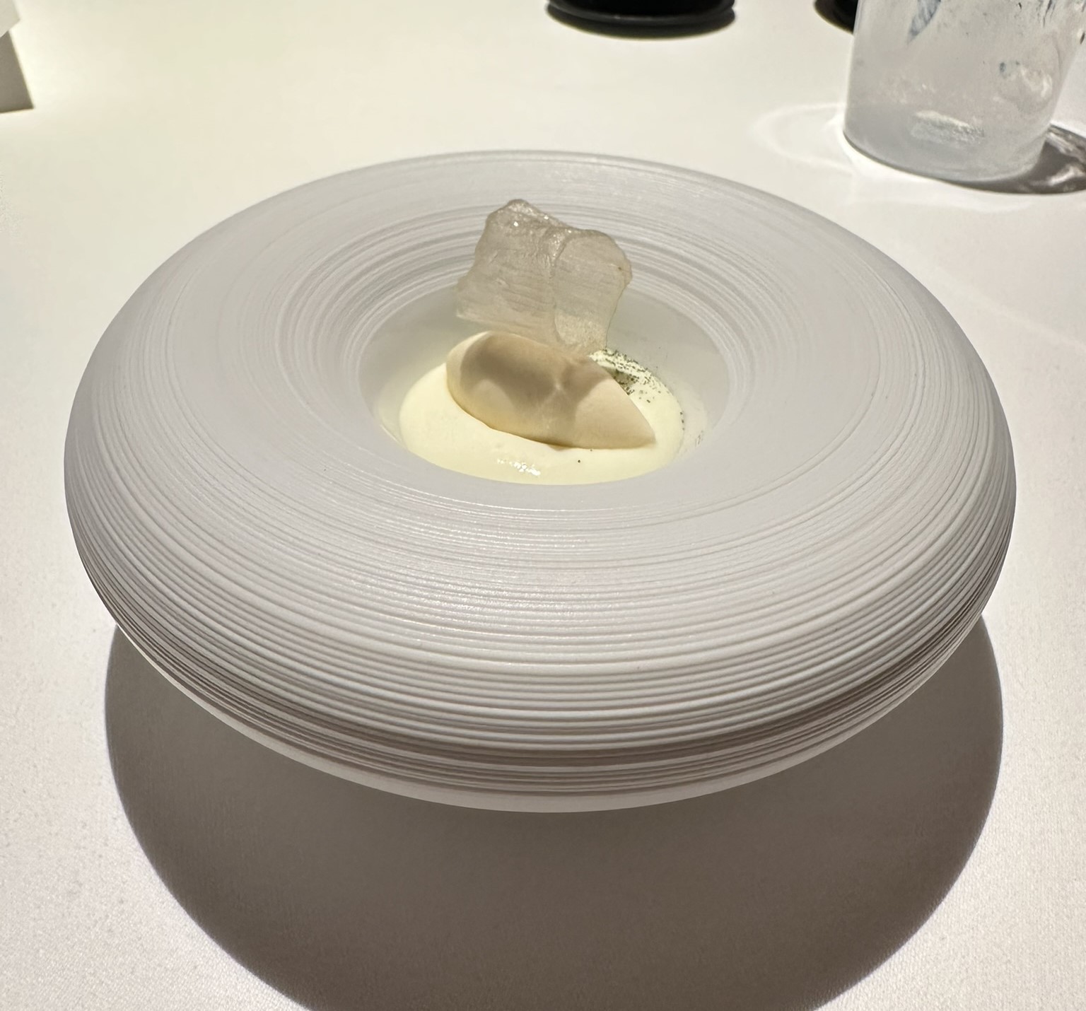 An amuse-bouche of Vichyssoise, Sea Cucumber, and Buttermilk followed. Traditionally a cold potato and leek soup with roots traced to New York City, Amador’s version arrived as an ice cream set atop airy buttermilk foam, with chunks of sea cucumber hidden beneath. Dehydrated leek added texture, while a bright citrus note tied the dish together. It was a bold, attention-grabbing introduction—shock value executed with precision.