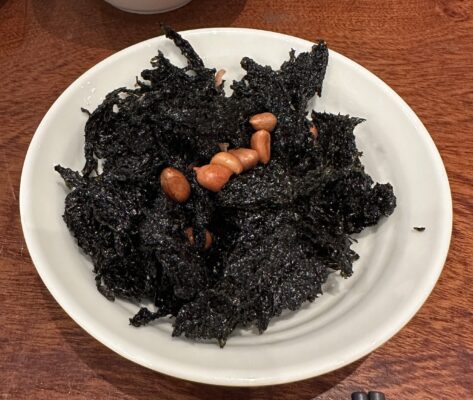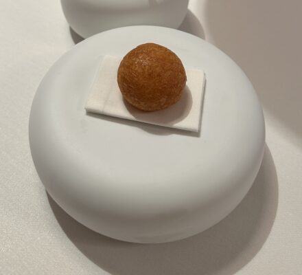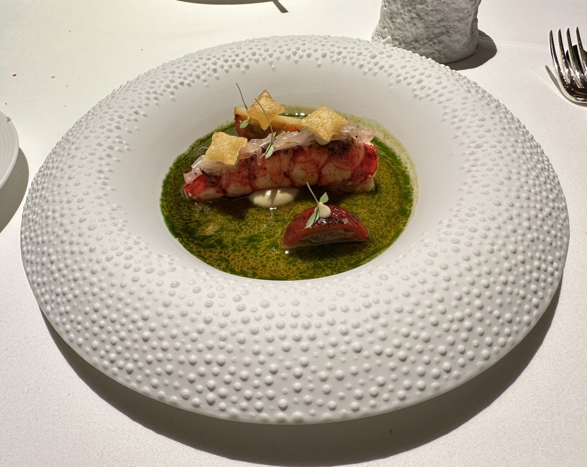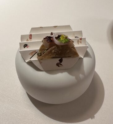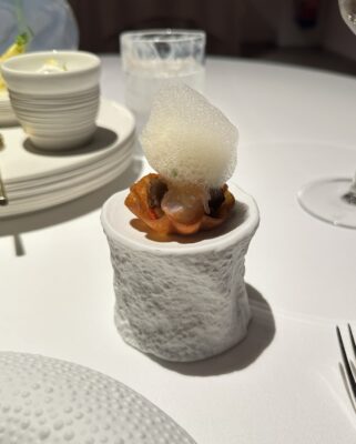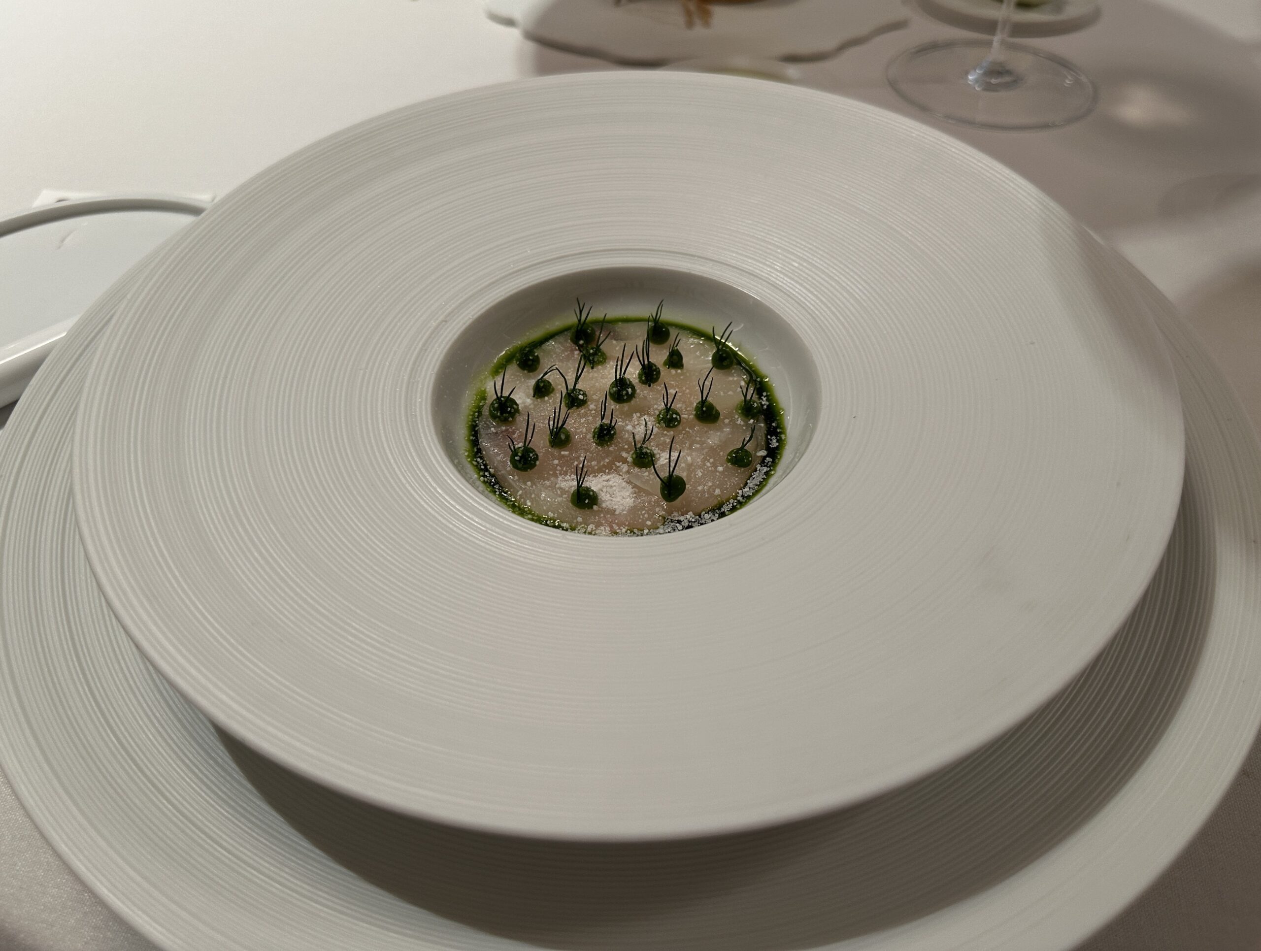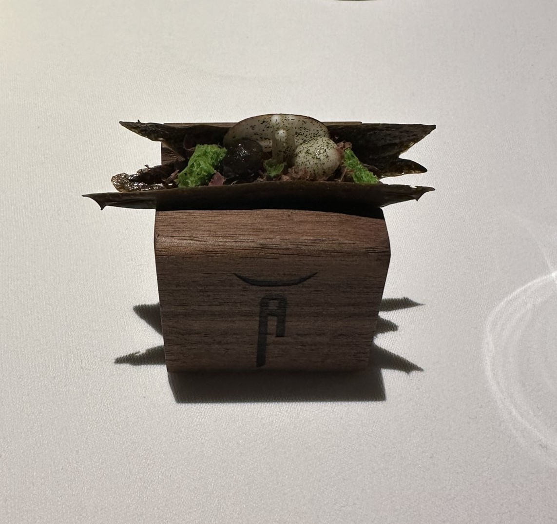 Amador is open exclusively for dinner and offers a single nine-course tasting menu priced at €395. Dinner began with “Tapas & Snacks,” a rapid-fire barrage of small bites. The King Crab, Jalapeño, Bisque delivered deep crustacean flavor, served alongside a potato roll generously filled with sweet crab meat. One of the restaurant’s signatures, Walk in a Forest, followed—an earthy composition of mushrooms, parsley, and smoked dried eel, layered with smoke and umami.