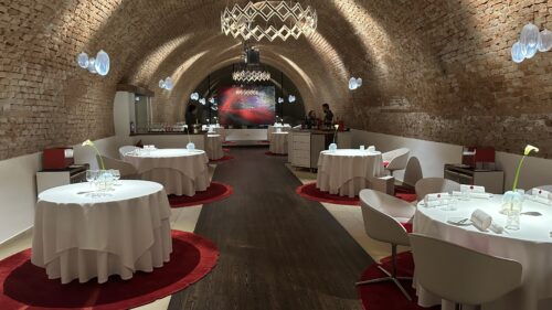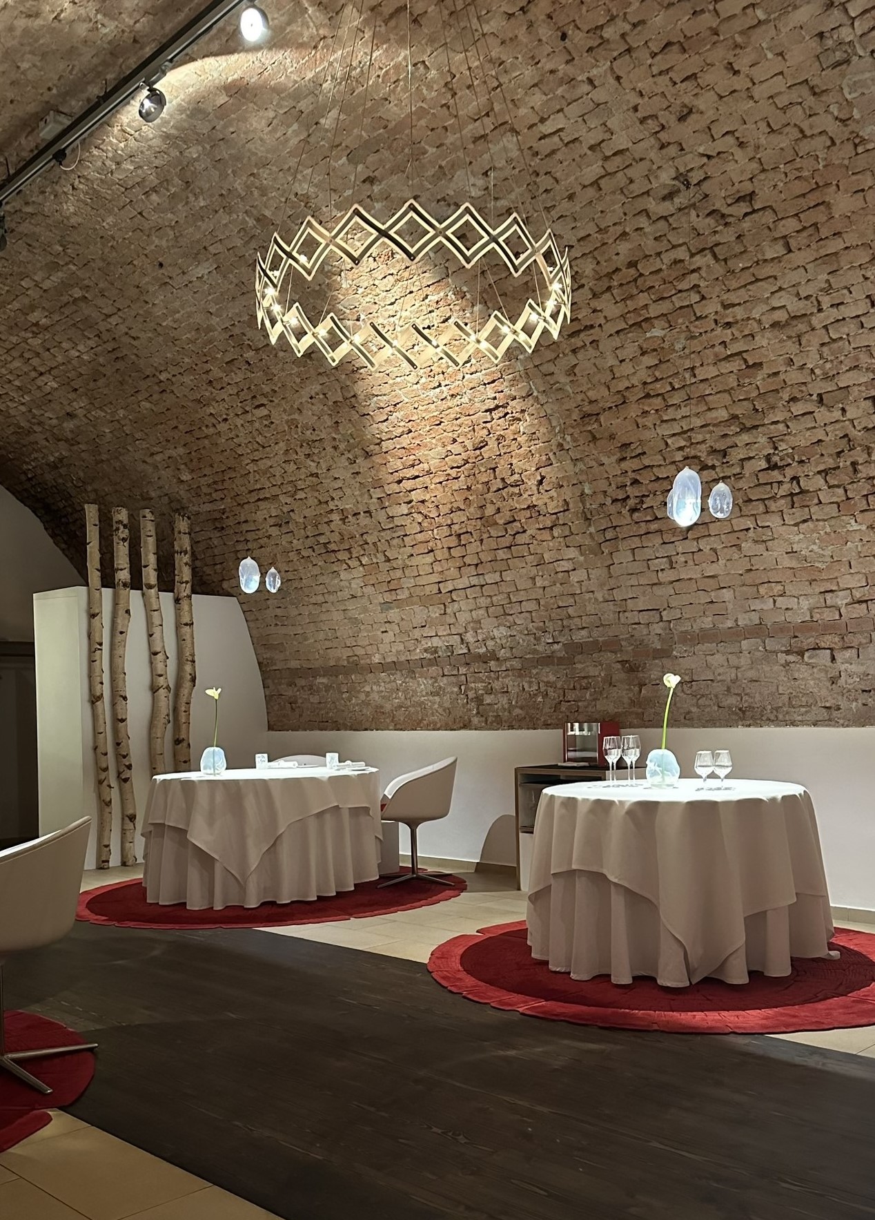 Amador is located on the outskirts of Vienna, reachable by tram or taxi, tucked into a quiet residential neighborhood. The restaurant is housed in a working winery, with the dining room set inside a former wine cellar. Vaulted brick ceilings create a dramatic yet restrained atmosphere. Uniform round tables are dressed in thick white tablecloths, while the interior leans modern and minimalist, dominated by white and red tones. Lighting is soft, and music is kept so low it’s nearly imperceptible—allowing full focus on what’s happening on the plate.