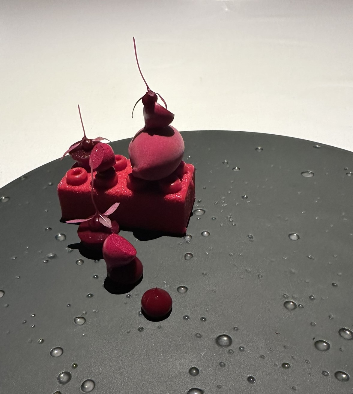 The main dessert, BRICK IN THE WALL – Spiced Milk , Beetroot ,Raspberry, is a signature inspired by Pink Floyd. Designed to resemble a Lego brick, it was made from spiced milk custard and tonka bean, encased in beetroot and raspberry. Additional textures—macaron, sorbet, and beetroot elements—completed the plate. On its own, the custard was subtly spiced, but when combined with the other components, the dessert became beautifully balanced and surprisingly complex.